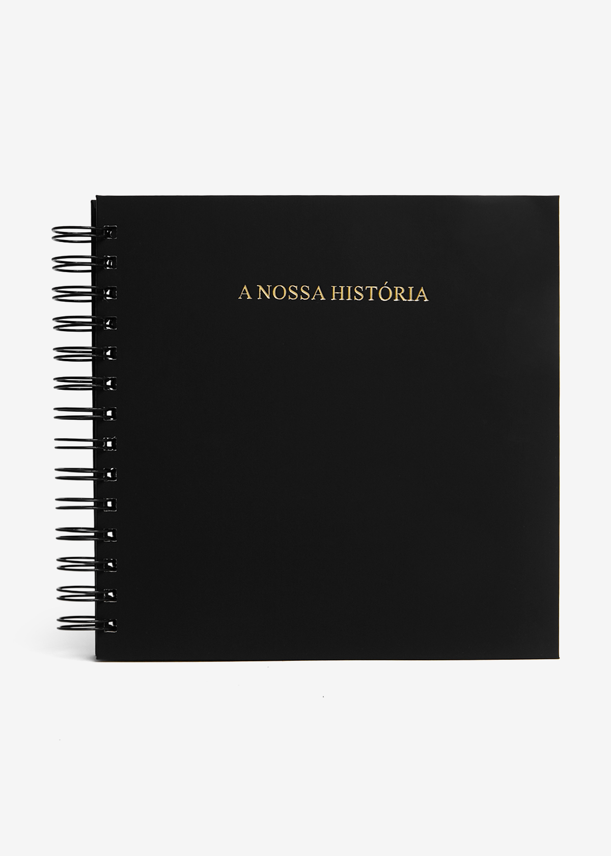 Ele tem o tamanho ideal de 20x20cm e é feito com papel de alta gramatura (180g), super resistente, 30 folhas lisas (60 páginas), perfeito pra colar fotos, adesivos ou desenhar. A capa dura tem acabamento premium com gravação em hotstamping dourado. A encadernação em wire-o preto combina minimalismo e durabilidade, pra durar a vida inteira!