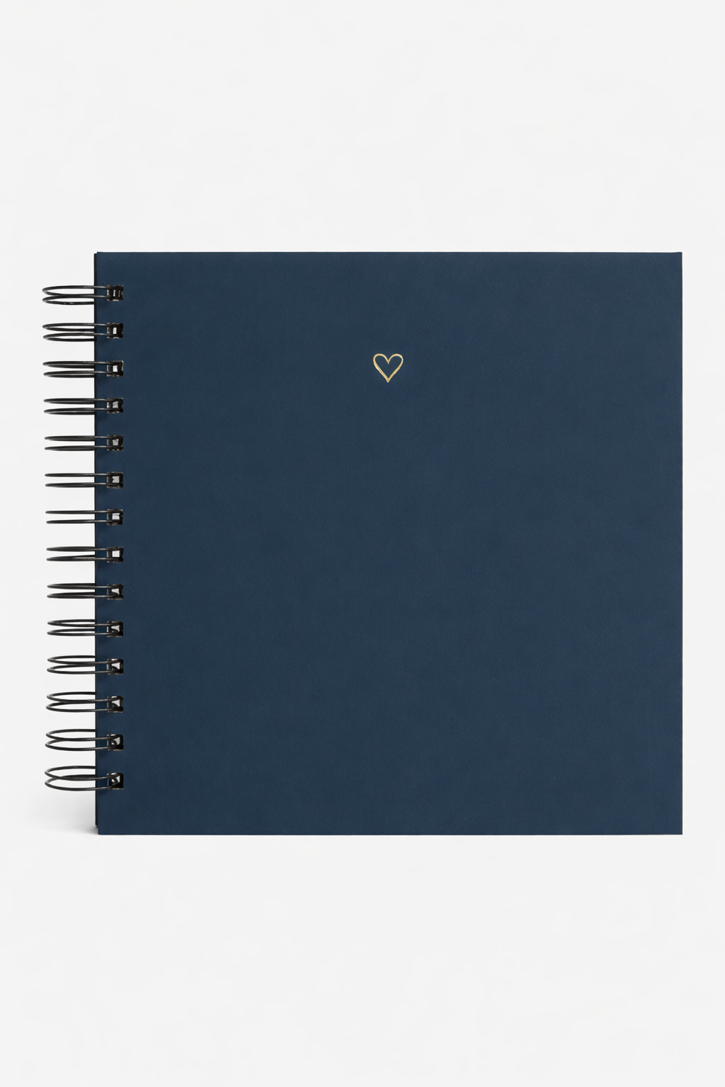 Ele tem o tamanho ideal de 20x20cm e é feito com papel de alta gramatura (180g), super resistente, folhas lisas, perfeito pra colar fotos, adesivos ou desenhar. A capa dura tem acabamento premium com gravação em hotstamping dourado. A encadernação em wire-o preto combina minimalismo e durabilidade, pra durar a vida inteira!