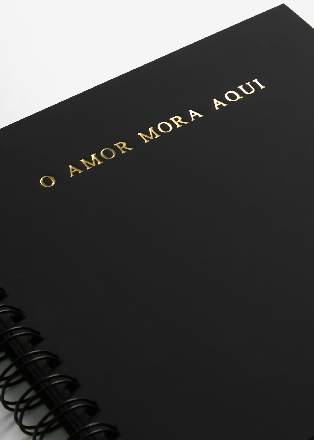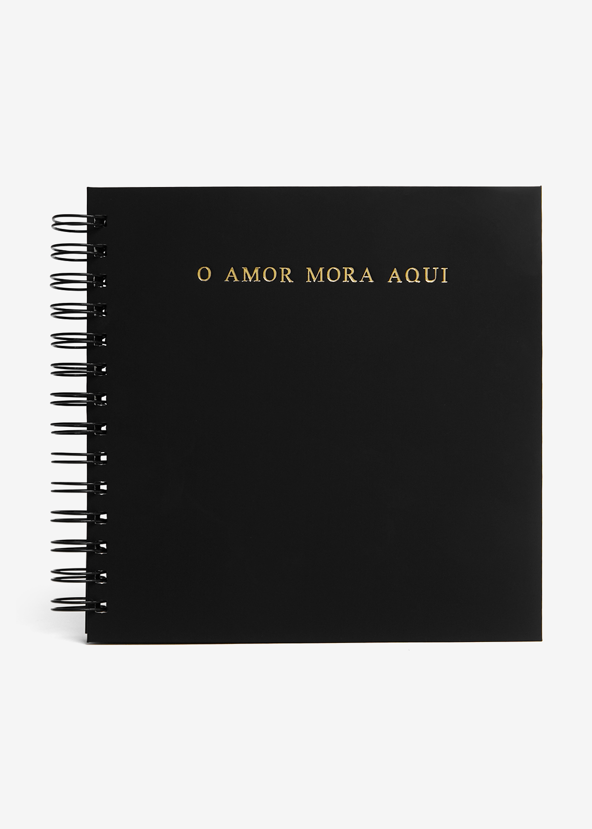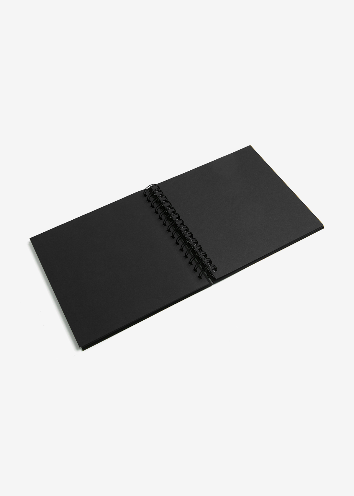 Ele tem o tamanho ideal de 20x20cm e é feito com papel de alta gramatura (180g), super resistente, 30 folhas lisas (60 páginas), perfeito pra colar fotos, adesivos ou desenhar. A capa dura tem acabamento premium com gravação em hotstamping dourado. A encadernação em wire-o preto combina minimalismo e durabilidade, pra durar a vida inteira!