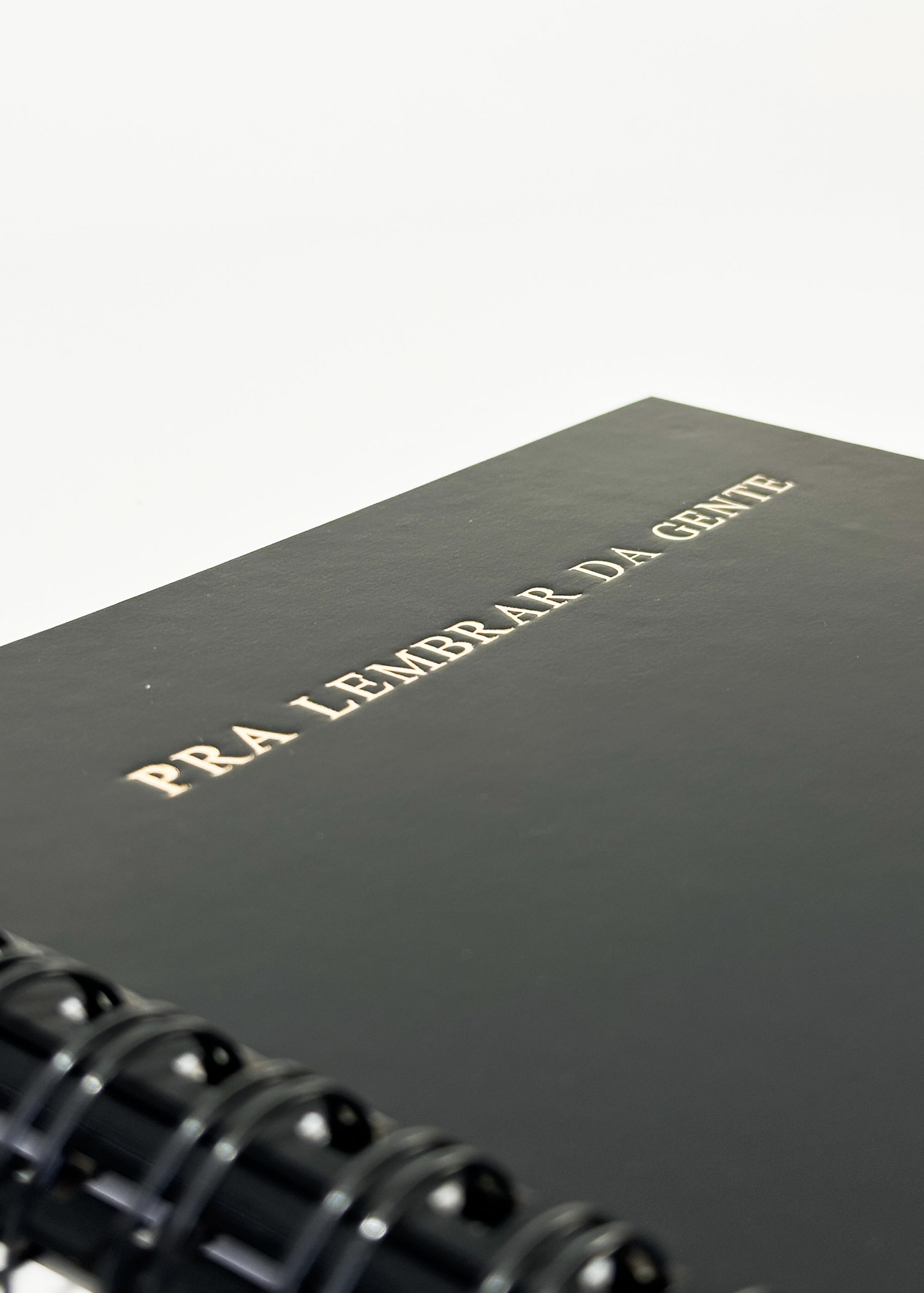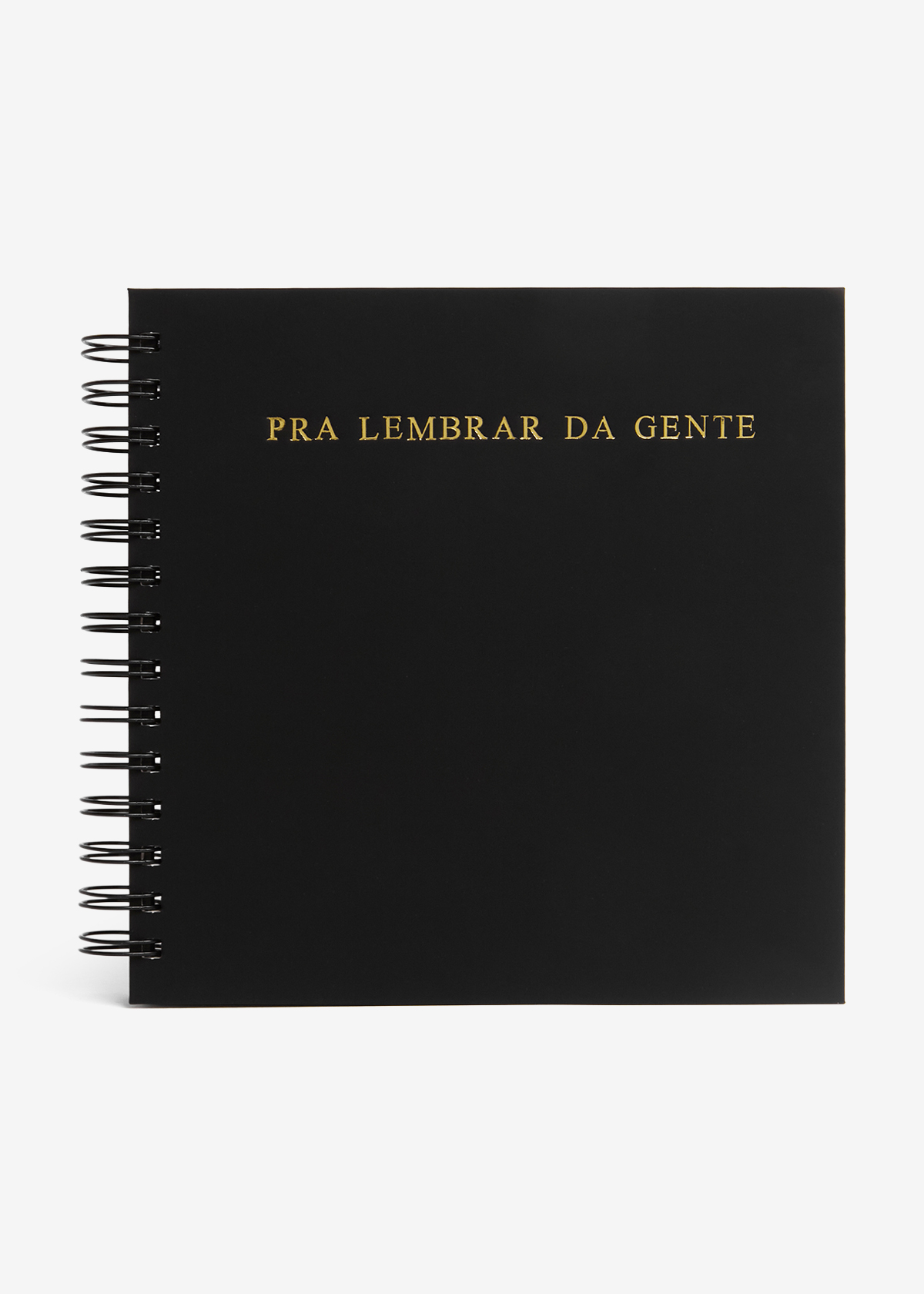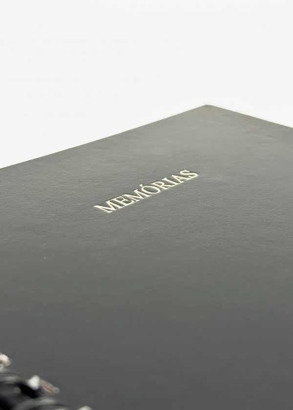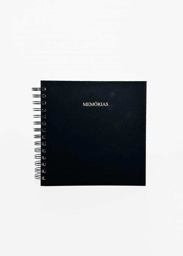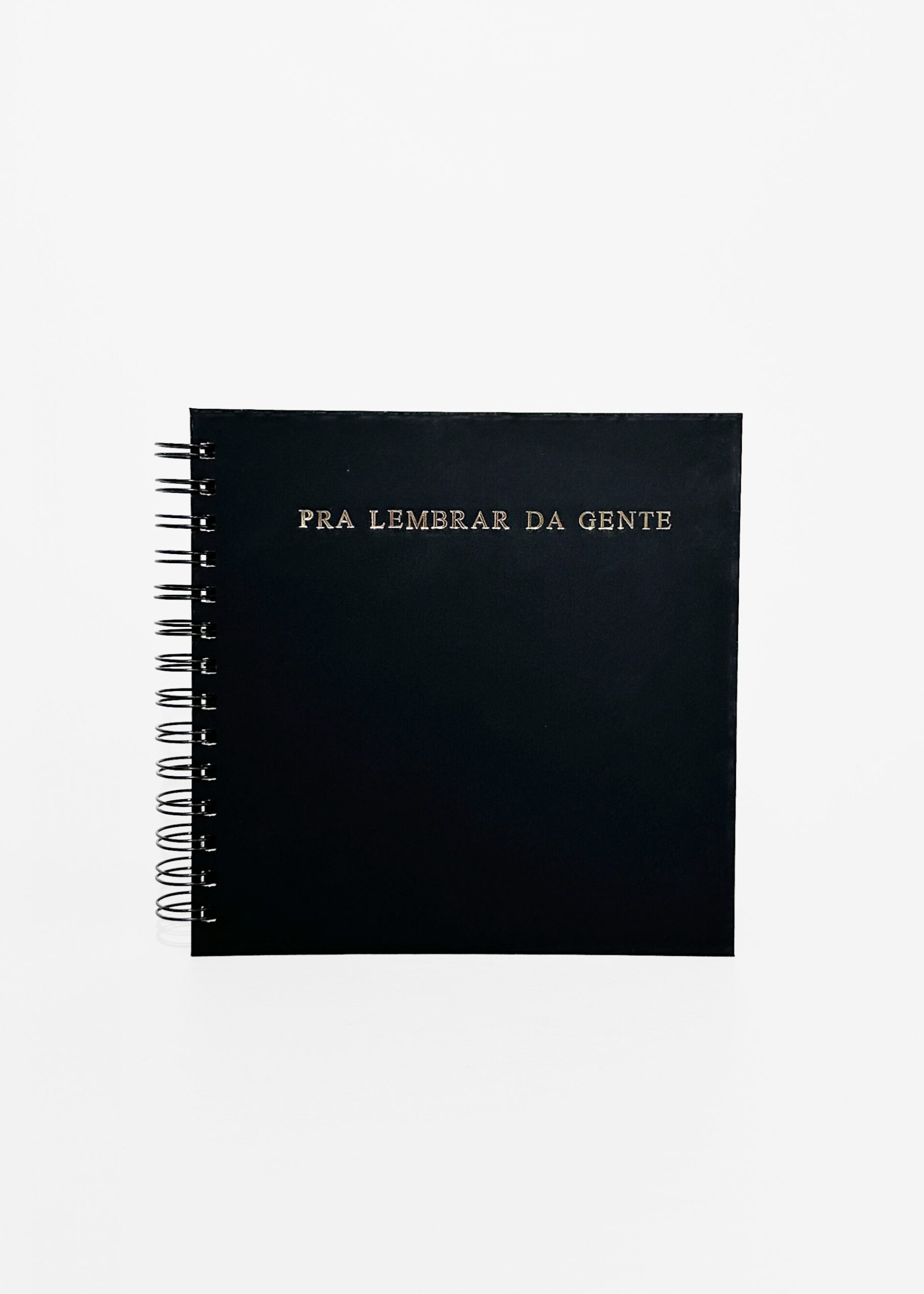 Ele tem o tamanho ideal de 20x20cm e é feito com papel de alta gramatura (180g), super resistente, 30 folhas lisas (60 páginas), perfeito pra colar fotos, adesivos ou desenhar. A capa dura tem acabamento premium com gravação em hotstamping dourado. A encadernação em wire-o preto combina minimalismo e durabilidade, pra durar a vida inteira!